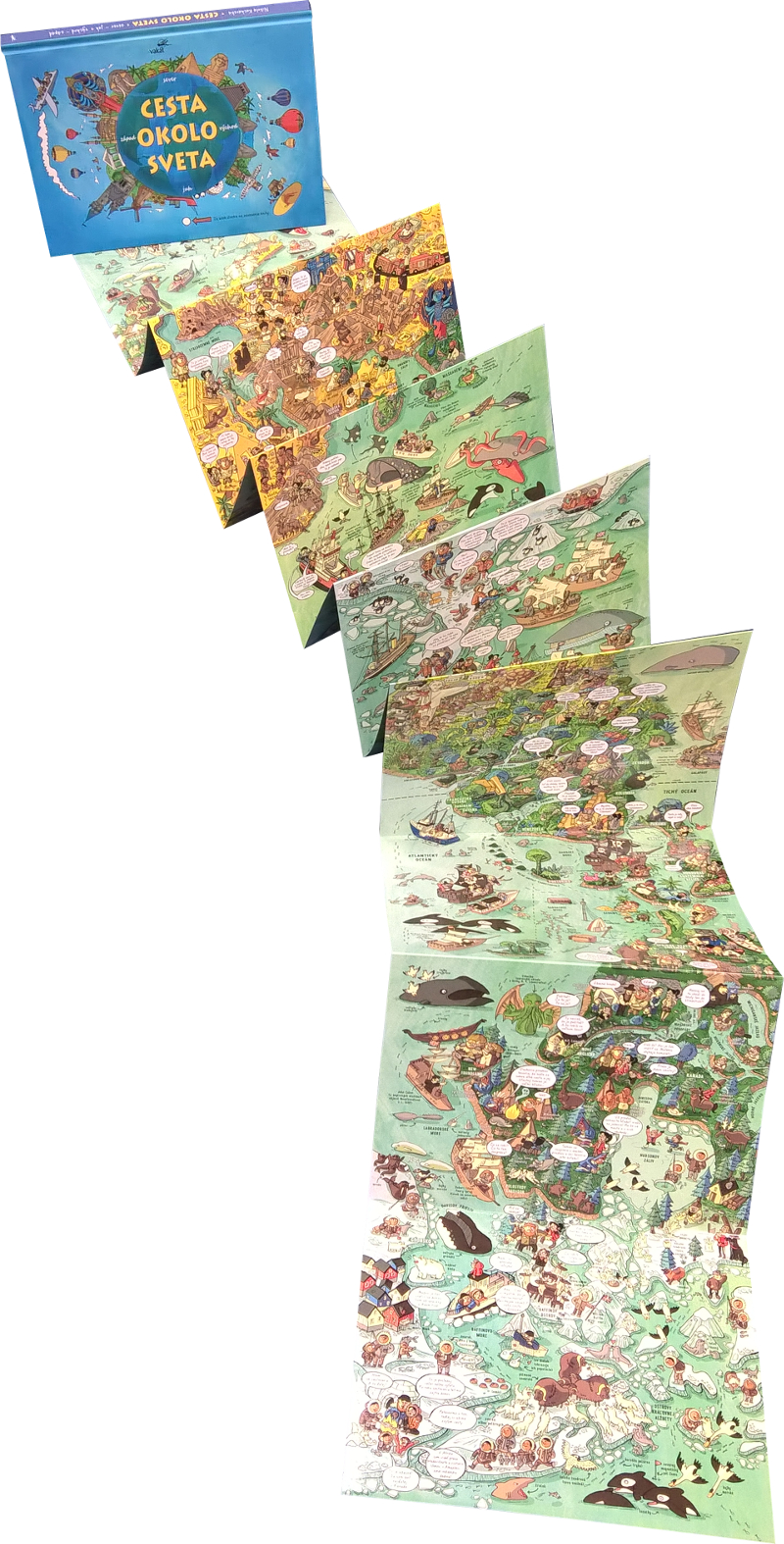 Knižka je unikátna tým, že ju malí čitatelia môžu zdolávať stranu po strane klasicky listovaním, alebo toto harmonikové dielko rozložia cez celú izbu. Knihu Cesta okolo sveta je možné rozložiť až na dĺžku troch metrov. Mapy obsahujú nielen zemepisné názvy, ale aj krátke zaujímavosti o najdôležitejších predmetoch.