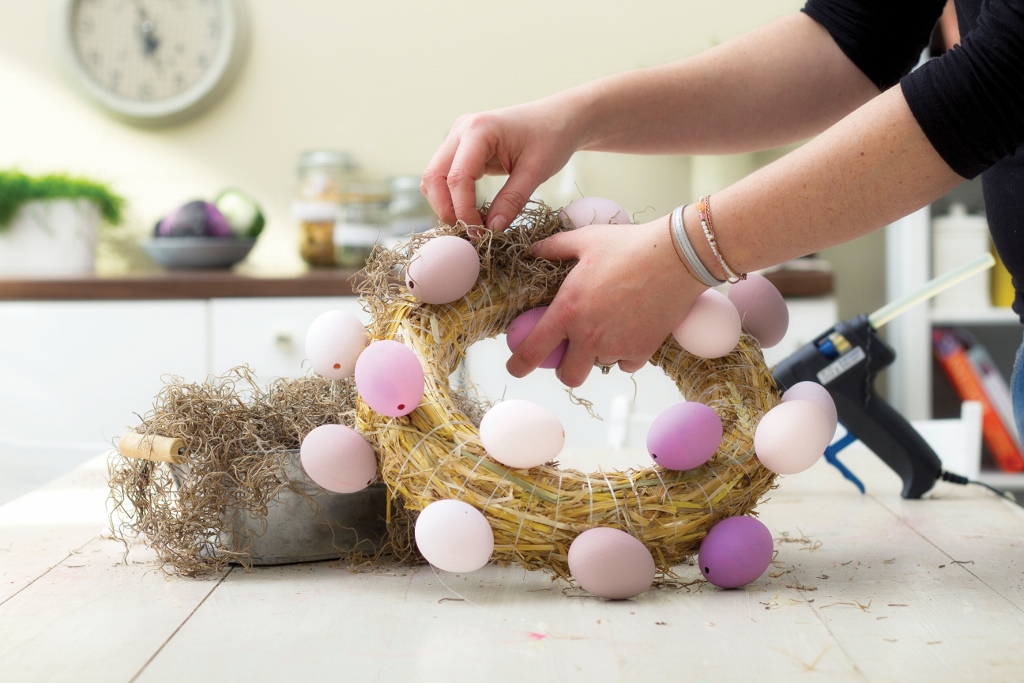 1. Tavnou pistolí přilepujte po celém obvodu a také ze stran věnce vyfoukaná vejce, rovnoměrně střídejte barvy a zároveň je držte ve stejném směru. Vyvarujte se však přílišné pravidelnosti! Kolik jich ve výsledku bude, je jen na vás, já použila přibližně 17 kusů..jpg)